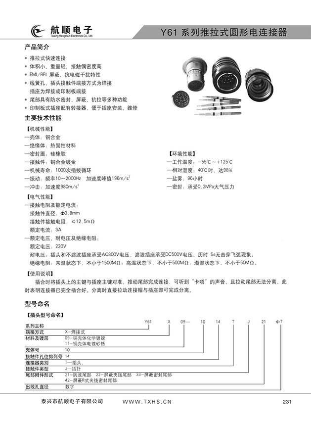Y61系列推拉式圓形電連接器,其連接方式為推入式鎖緊塊鎖緊,該鏈接器具有插拔迅速,使用方便,體積小,密度高,耐環(huán)境好,外形美觀,屏蔽性好等特點。